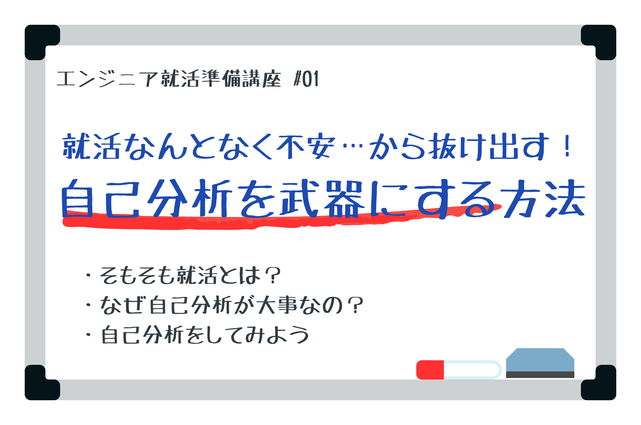 ①なんで就活ってするの? ‐就活って何でしなきゃいけないの?エンジニア就活のリアルをお届けします。 ②自己分析って本当に大事? -自己分析ってぶっちゃけ必要?について徹底解説します。 ③自己分析ってどうやるの? ‐迷子になりがちな自己分析のやり方を、ワークショップ形式でお伝えします。 |